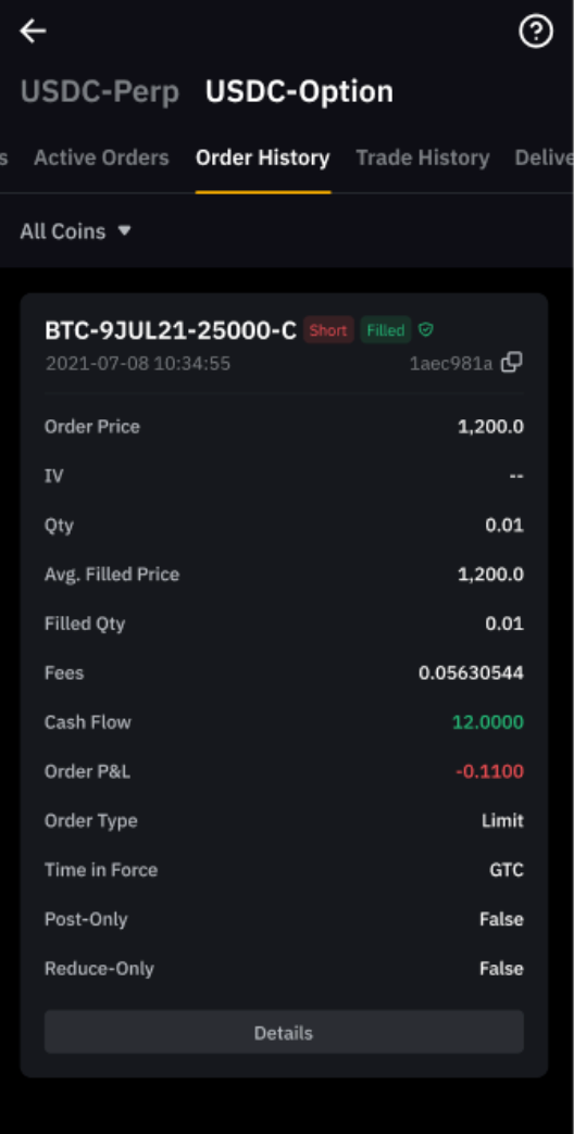 Você pode acessar o Histórico de ordens para visualizar os detalhes da ordem de proteção ou o Registro de transações da UTA para visualizar os detalhes da liquidação das opções compradas por meio do Perp Protect.