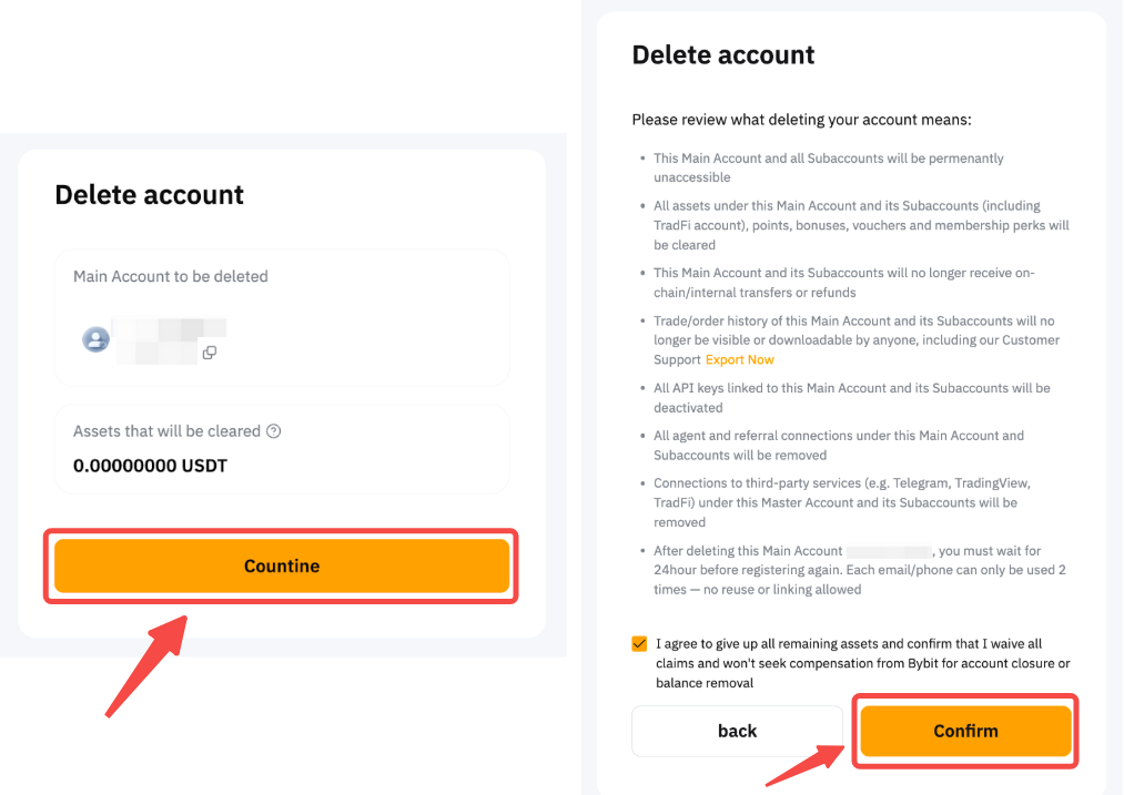 Step 2: Review and confirm the account details, including any associated subaccounts and remaining assets. Please ensure to understand the consequences of deleting your account before tapping on Confirm.