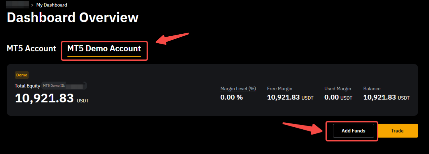 Пользователи могут получить доступ к панели управления демо-аккаунта, как показано на скриншоте ниже, и нажать Перевести, чтобы добавить демо-средства на демо-аккаунт TradFi (MT5).