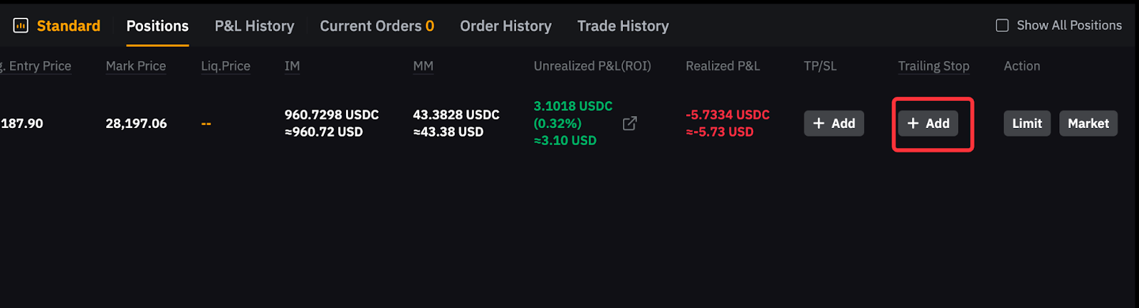 Щоб встановити або налаштувати Трейлінг-стоп на Bybit, просто перейдіть на вкладку Позиції та встановіть його за такими параметрами: