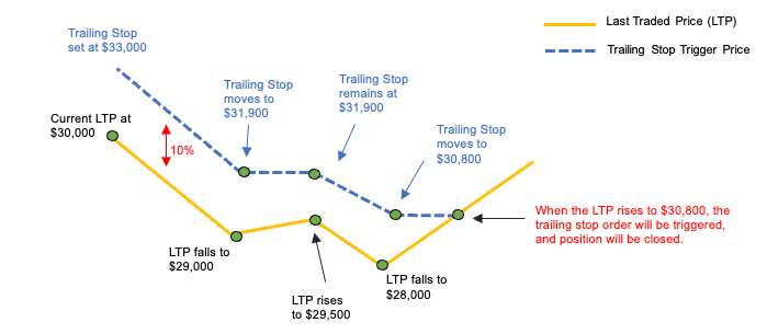 Припустимо, що трейдер B відкриває коротку позицію в BTCUSD на 31 000 USD та встановлює ордер Трейлінг-стоп з коефіцієнтом корекції 10%.