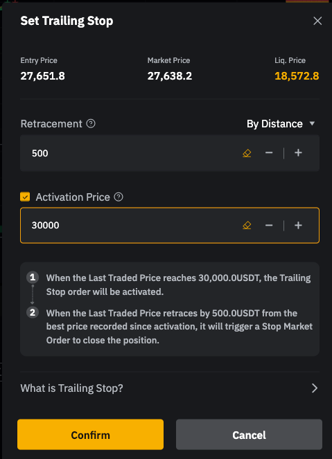 Припустимо, що трейдер B має довгу позицію в контракті BTCUSDT, а ціна останньої угоди складає 28 000 USDT. Трейдер хоче розмістити Трейлінг-стоп з відстанню 500 USDT, щойно ціна останньої угоди досягає 30 000 USDT.