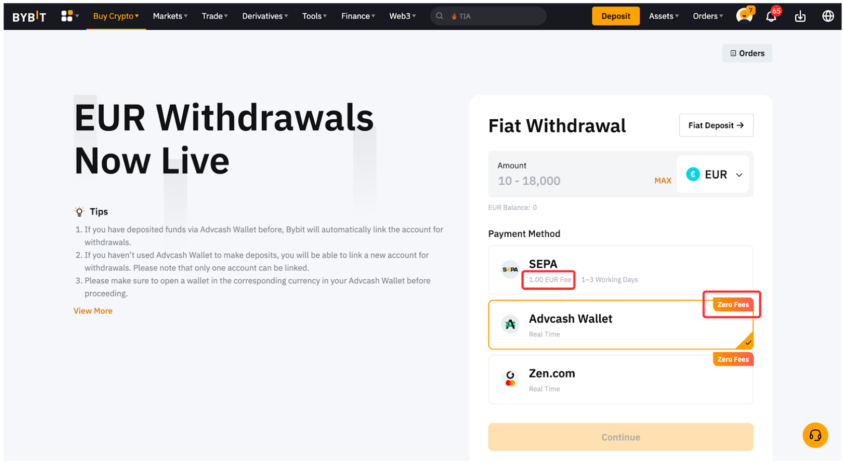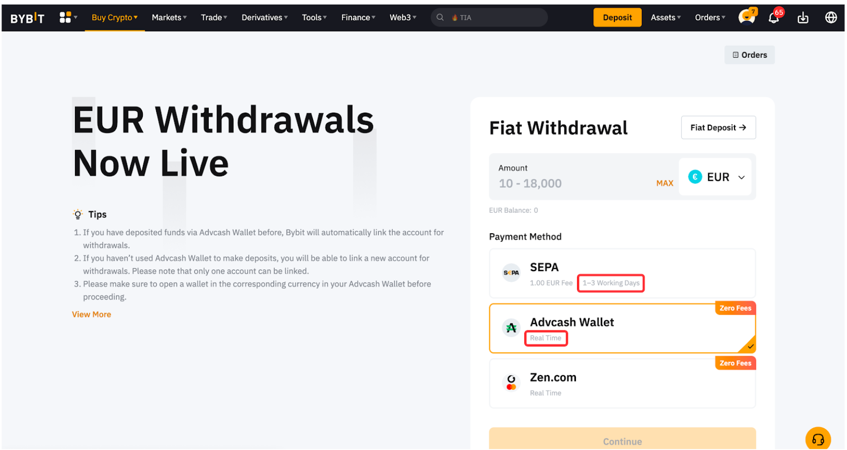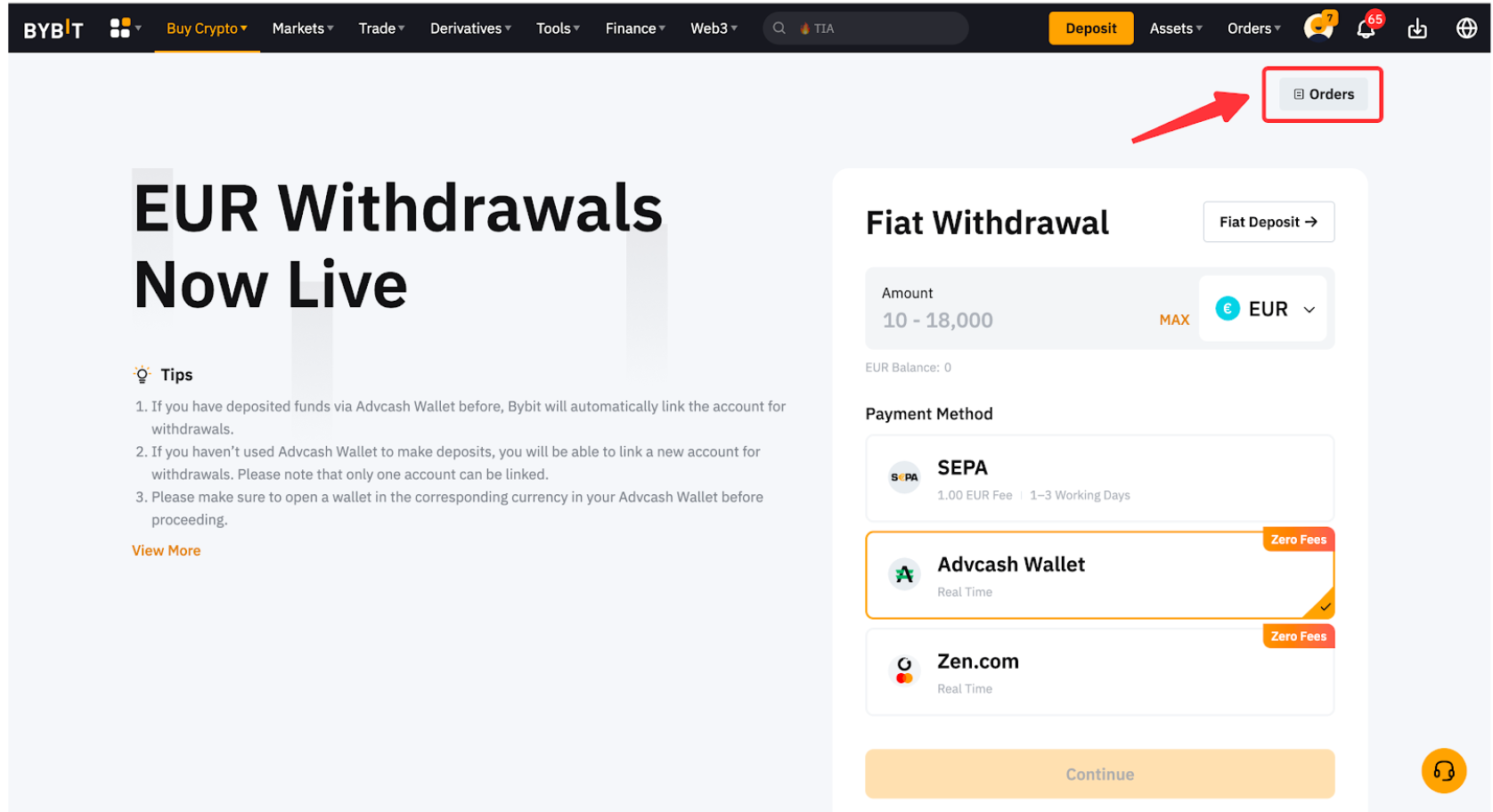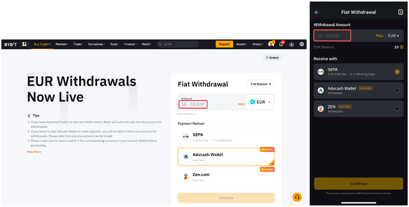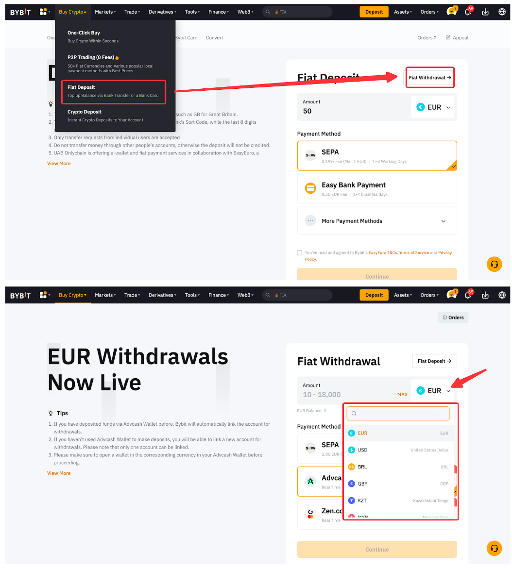 Chỉ một số lượng tiền tệ fiat được chọn mới có thể rút được trên Bybit. Bạn sẽ có thể thấy các loại tiền pháp định được hỗ trợ để rút tiền pháp định trên trang rút tiền Fiat.
