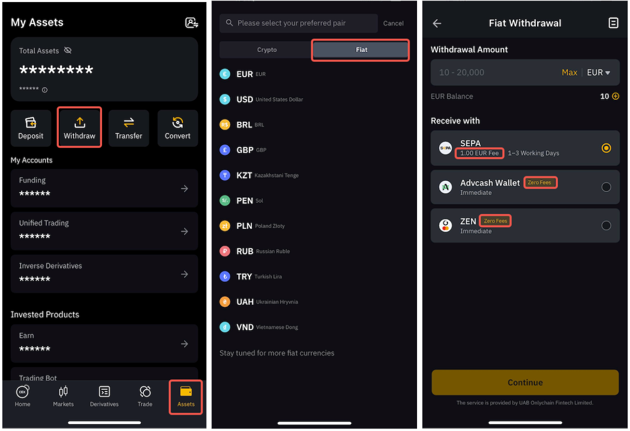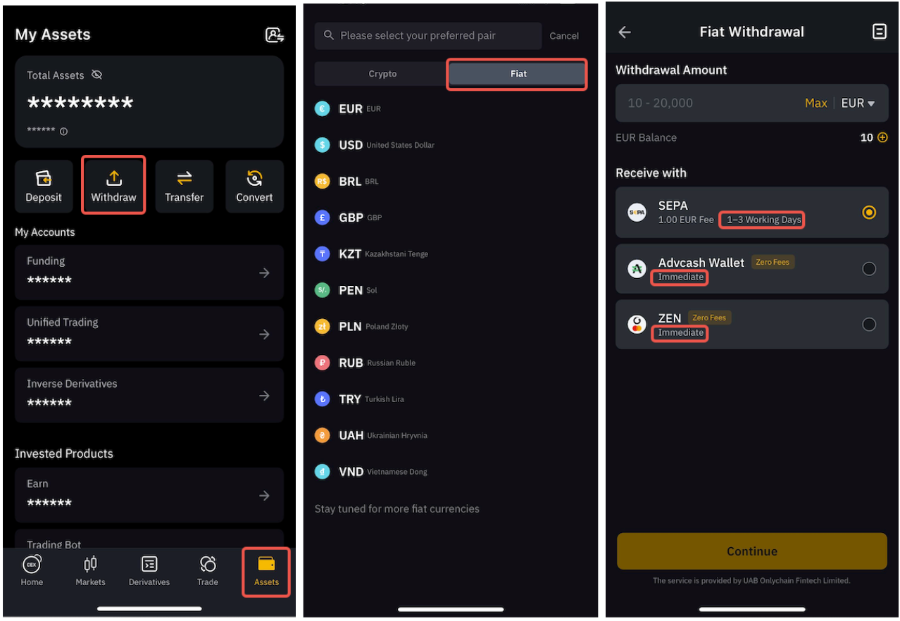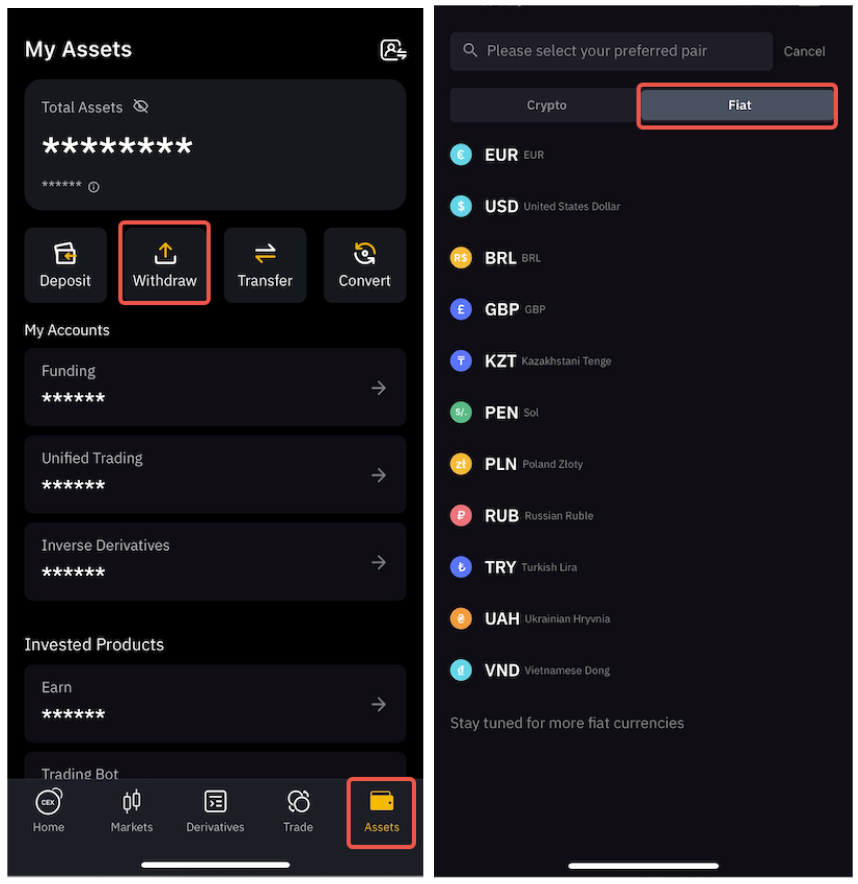 Trên Ứng dụng, vui lòng chuyển đến tab Tài sản và nhấn vào Rút tiền, sau đó chuyển sang phần Fiat để truy cập danh sách các tùy chọn được hỗ trợ.
