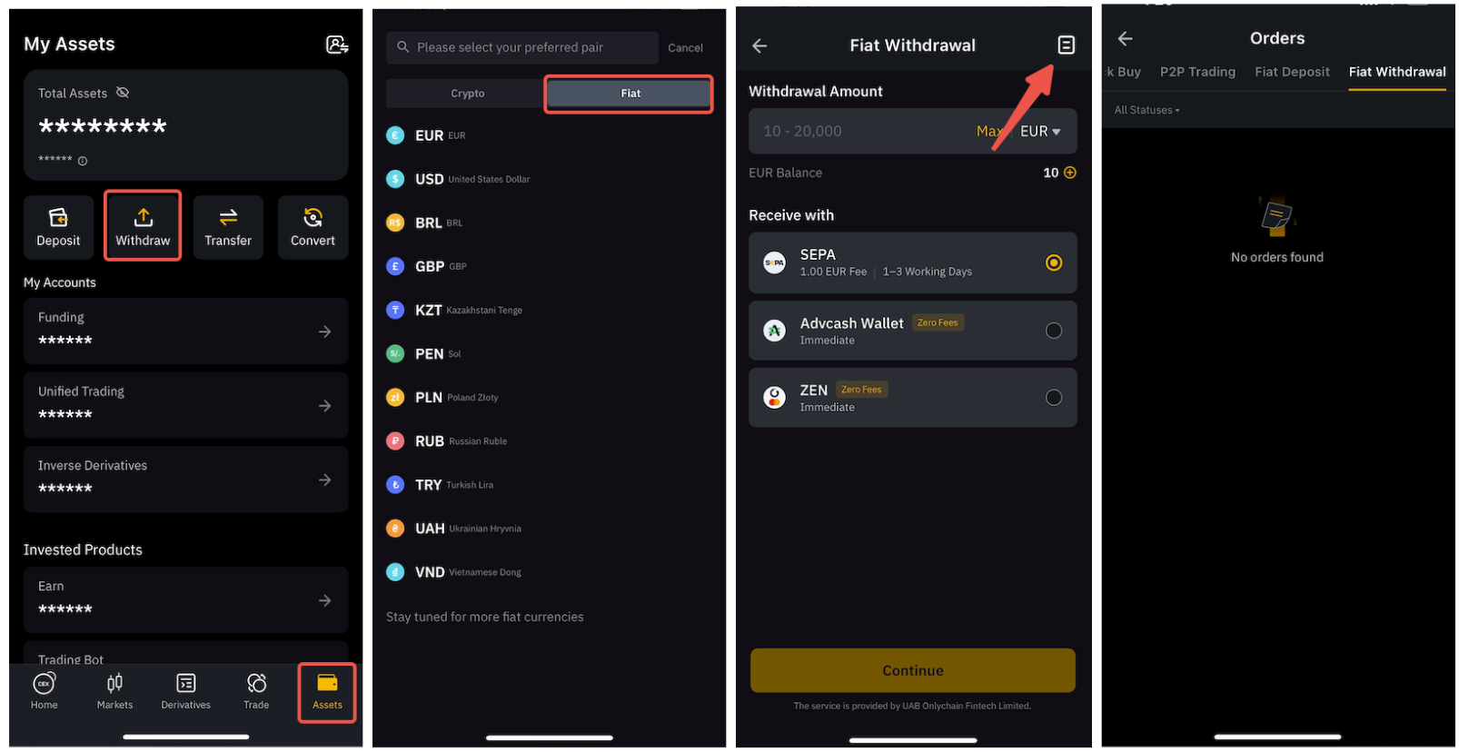 Trên Ứng dụng, vui lòng chuyển đến tab Tài sản và nhấn vào Rút tiền, sau đó chuyển sang Fiat → chọn bất kỳ loại tiền pháp định nào → nhấn vào biểu tượng trang.