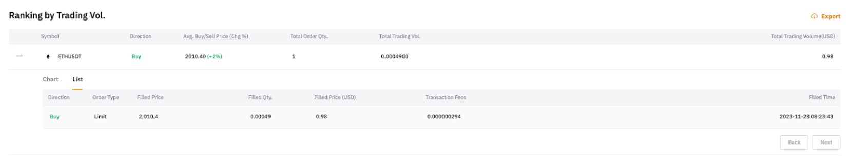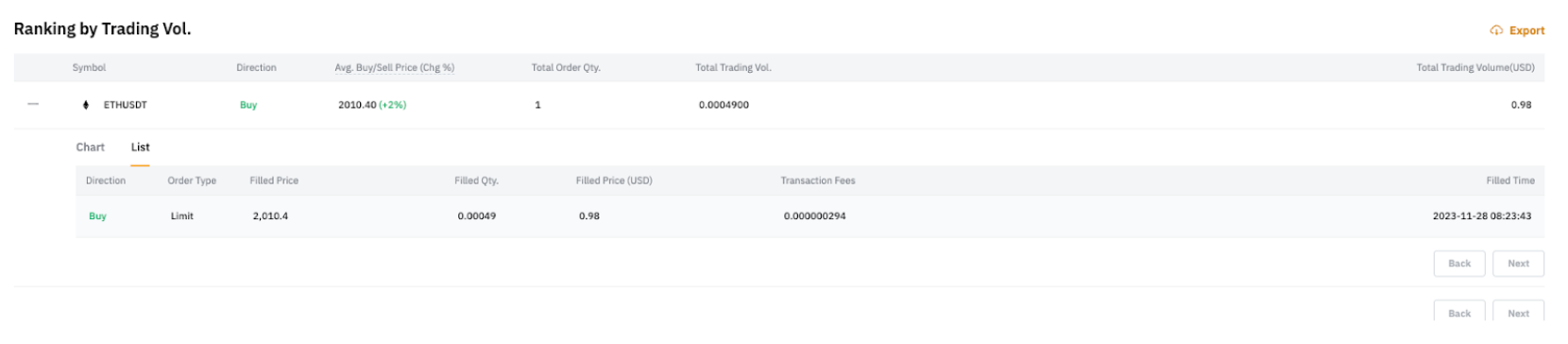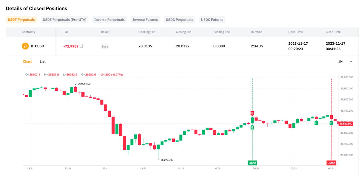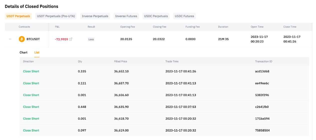 Trên tab Danh Sách, bạn có thể truy cập tất cả các giao dịch liên quan đến vị thế. Tab này chỉ hiển thị các vị thế đóng hoàn toàn. Để biết chi tiết lệnh liên quan đến các vị thế đóng một phần, bạn có thể tham khảo Chi Tiết Các Lệnh Đã Đóng trong Hiệu Suất Giao Dịch.
