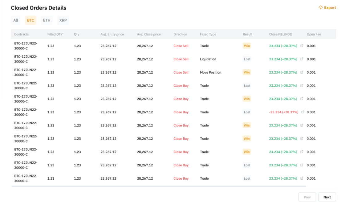 Mục này cho biết P&L Đóng của tất cả các lệnh đã đóng. P&L Đóng = P&L Vị Thế - Phí Mở - Phí Đóng - Phí Funding |