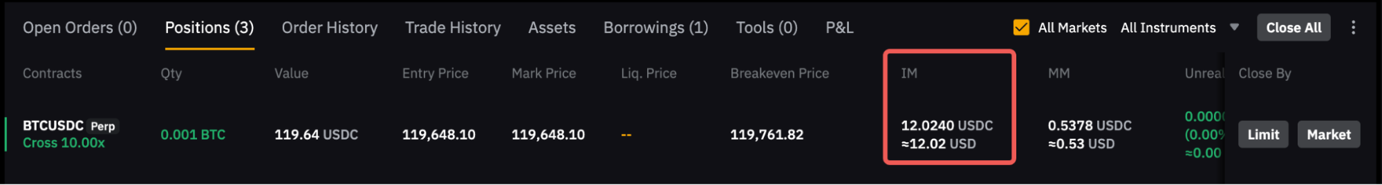 请注意,仓位选项卡中显示的起始保证金包括 Taker 费,该费用可能会在平仓时产生。